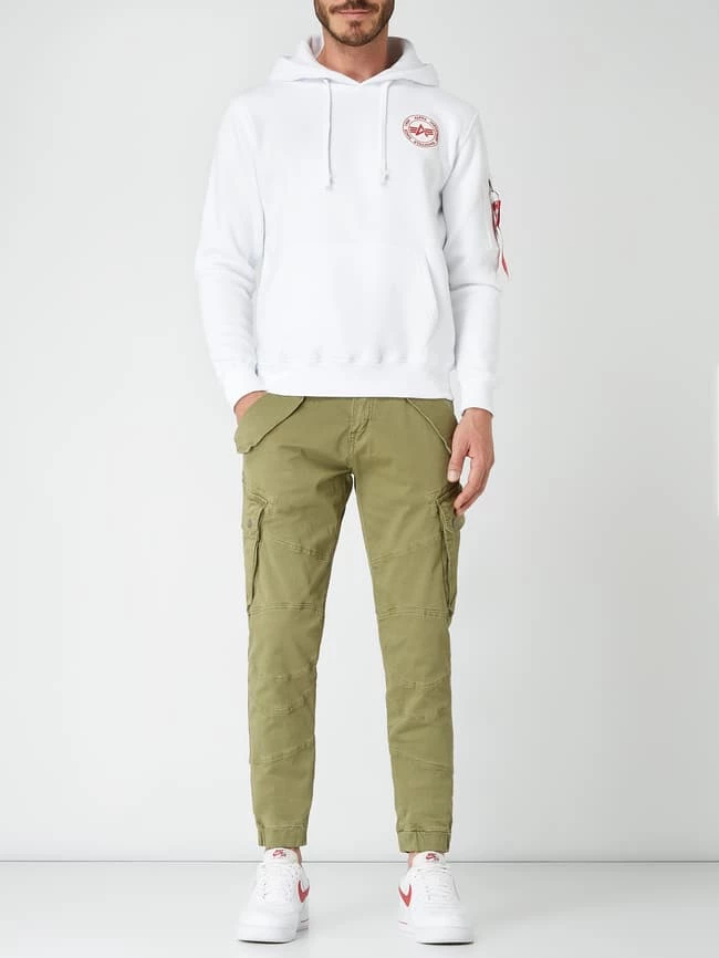 Die Cargohose von Alpha Industries ist aus einem Baumwoll-Elasthan-Mix gefertigt und gerade geschnitten. Sie zeigt sich im unifarbenen Design mit Label-Details.